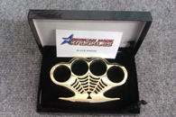 Welcome to the Black Widow Brass Knuckles page. We gurantee you won't find better brass knuckle on the market today. Each knuckle is hand polished down to the last detail and they come with a black velvet carrying case. This is one of our four-finger brass knuckles with a spider web cut out in the palm area. We have this brass knuckles for sale below. |