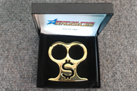 Welcome to the Pay Up-Two Brass Knuckles page. We make real brass knuckles and each one is hand polished down to the last detail. They come with a black velvet carrying case inside of a gift box. This is one of our two-finger brass knuckles with the dollar sign cut in the palm area. |