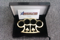 Welcome to the 2 Spades brass knuckles page. We gurantee you won't find a better brass knuckle on the market today. You better hurry cause they will go fast. Each knuckle comes with a black velvet carrying case in a gift box. Wait till you see them shine in person. This four-finger brass knuckle has two classic spades cut in each pocket. Get yours today! |